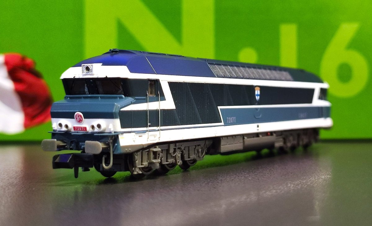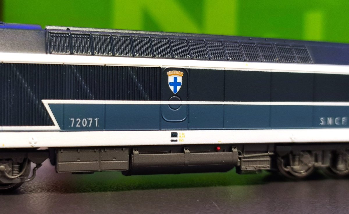 Locomotive diesel SNCF CC 72071, livrée Arzens d’origine à plaques, blason Marseille, dépôt de Rennes