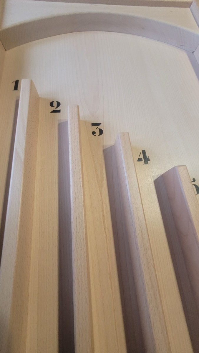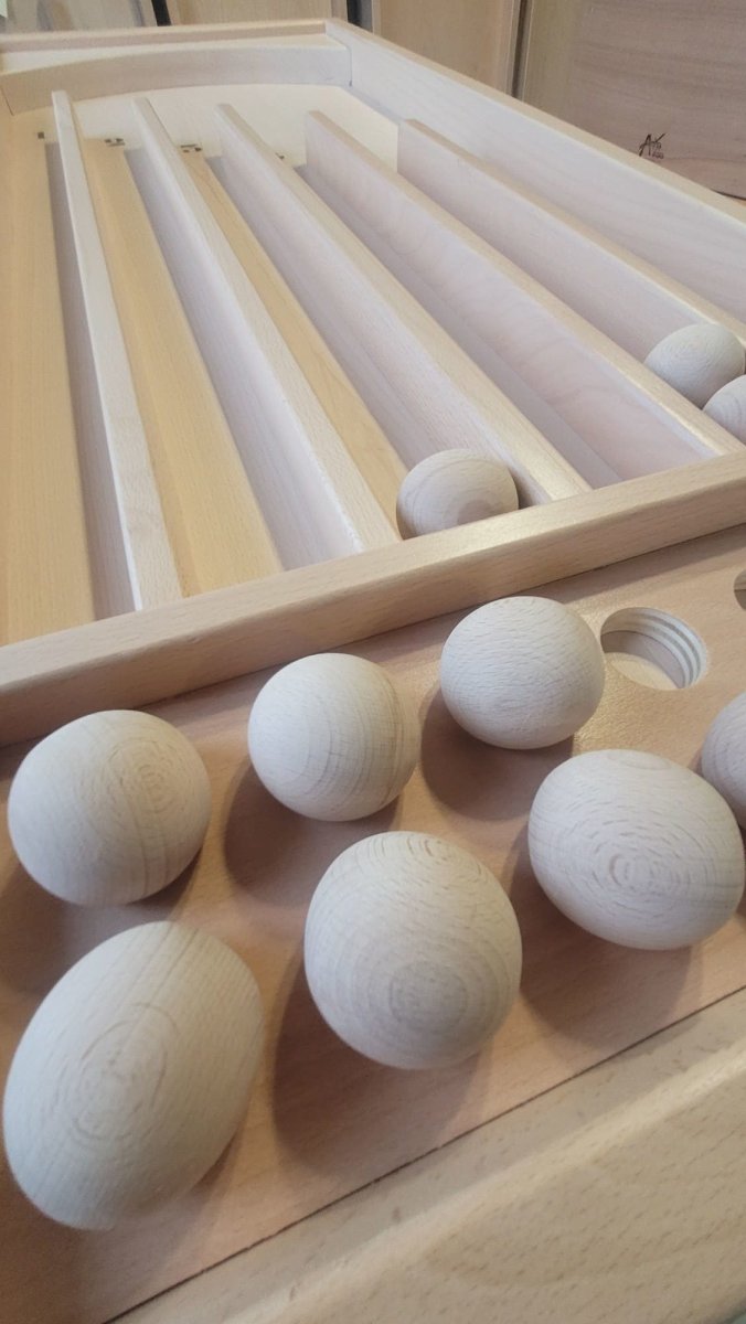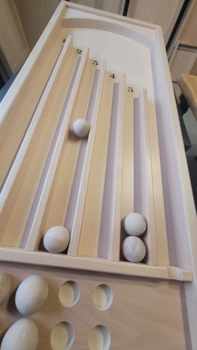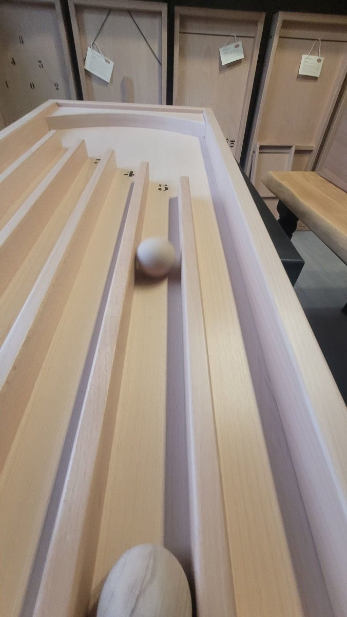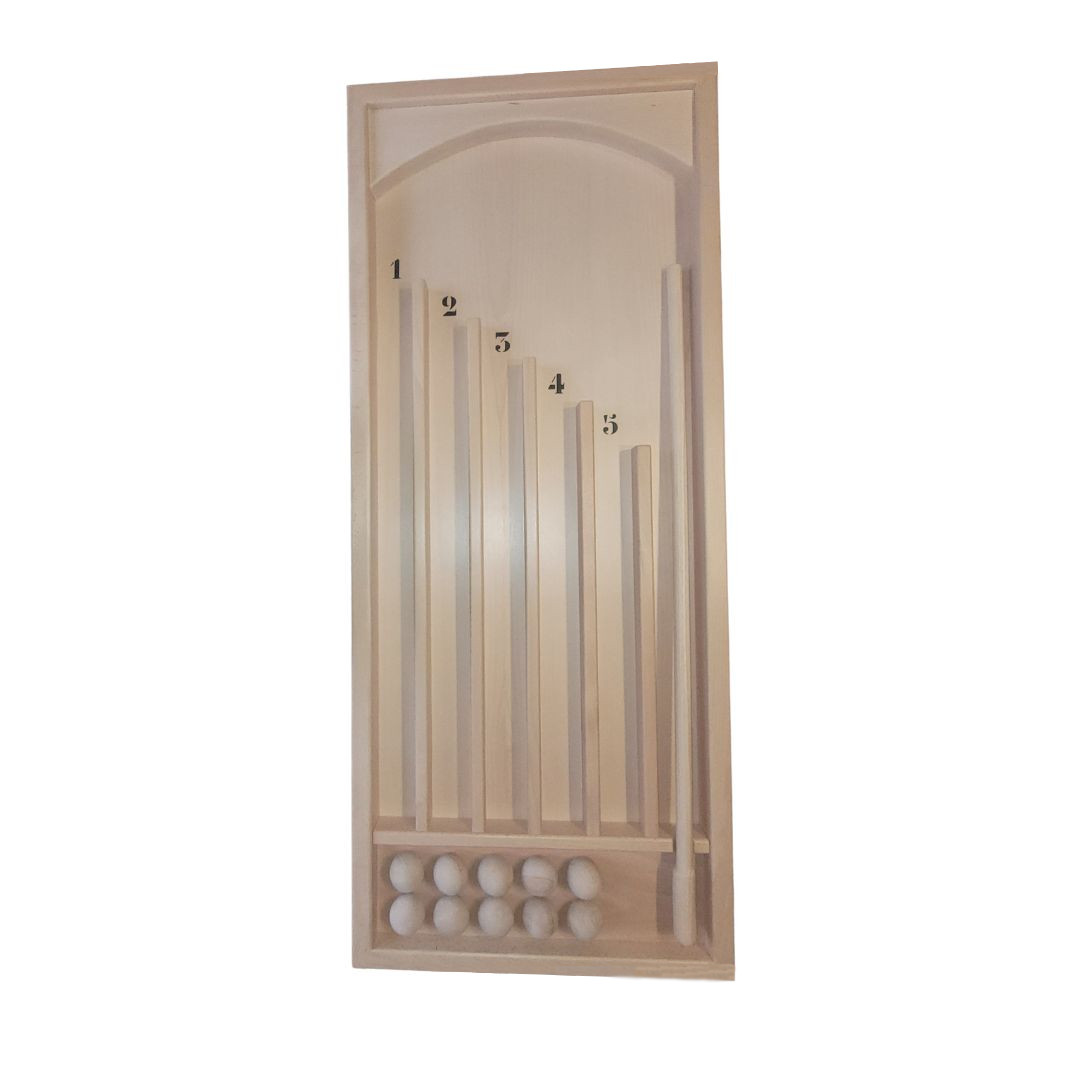 Jeu de 10 boules qu’il vous faudra envoyer dans les couloirs de points à l’aide de la queue. Il vous faut de l’adresse et de la précision. Celui qui obtient le plus de point à gagner. Dimensions L.128cm x l.47cm x H.12cm au plus haut, 6cm au plus bas. Diamètre des boules env.4,5cm